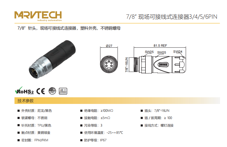 7/8"-コーナーニードル-現場配線可能コネクタ-プラスチックケース-ステンレスナット-3/4/5/6 PIN