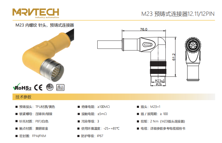 M23-雌ねじ-針-プレキャストコネクタ-12.11/12 PIN