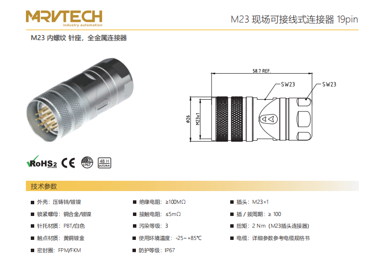 M23-雌ねじ-針座-全金属コネクタ-19 pin