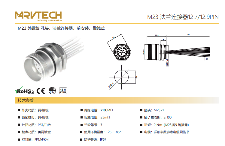 M23-雄ねじ-口金-フランジコネクタ-前取付-散線式-12.7/12.9 PIN