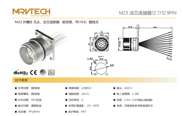 M23-雄ねじ-口金-フランジコネクタ-前面取付-RS19.8-散線式-12.7/12.9PIN