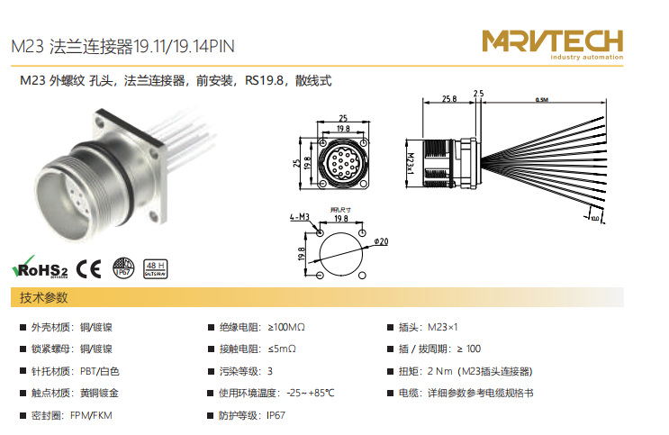 M23-雄ねじ-口金-フランジコネクタ-前面取付-RS19.8-散線式-19.11/19.14PIN