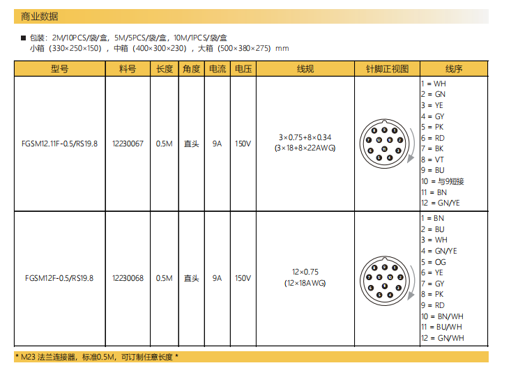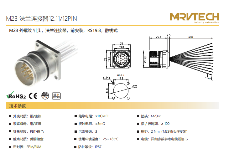 M23-雄ねじ-針-フランジコネクタ-前面実装-RS19.8-散線式-12.11/12PIN