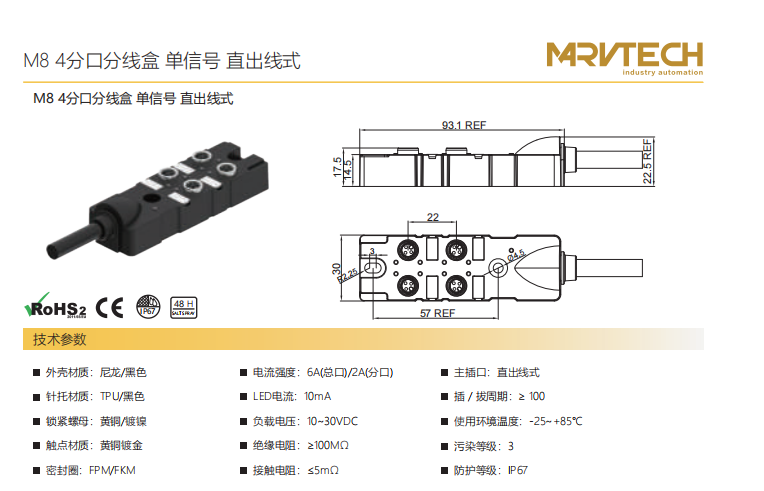 M8-4タップ分線箱-単信号-垂直M12ソケット式
