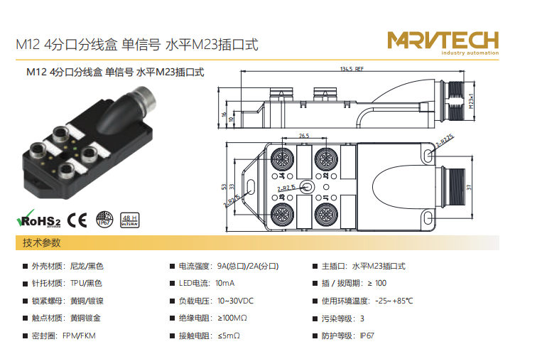 M12-4スプリットスプリットボックス-単信号-水平M23ソケット式