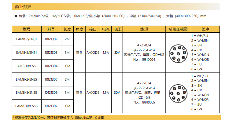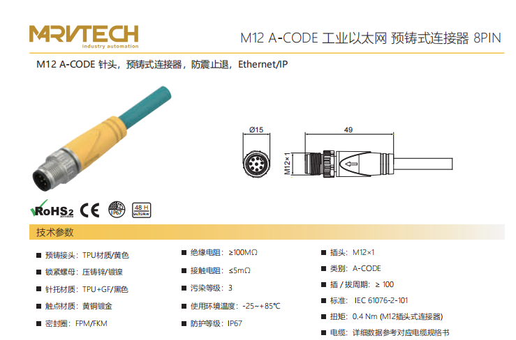 M12-A-CODE-ピン-プレキャストコネクタ-防振後退防止-Ethernet/IP-Cat6-8PIN
