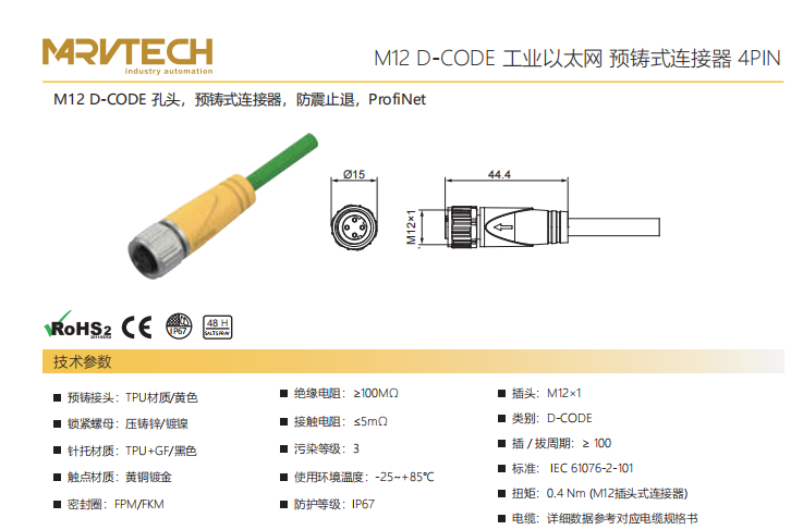 M12-D-CODE口金-プレキャストコネクタ-防振後退防止-ProfiNet-4PIN