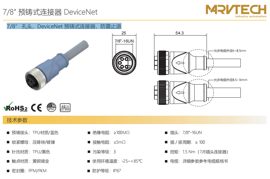 7/8”オリフィス-DeviceNetプレキャストコネクタ-防振後退防止