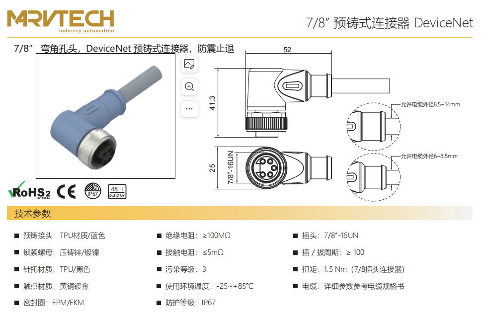 7/8”オリフィス-DeviceNetプレキャストコネクタ-防振後退防止