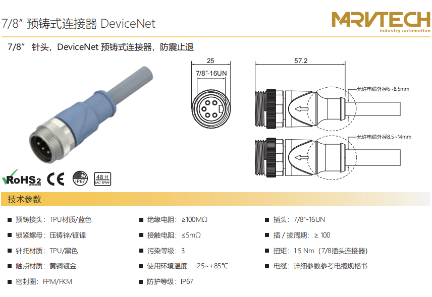 7/8」コーナーニードル-DeviceNetプレキャストコネクタ-防振後退防止