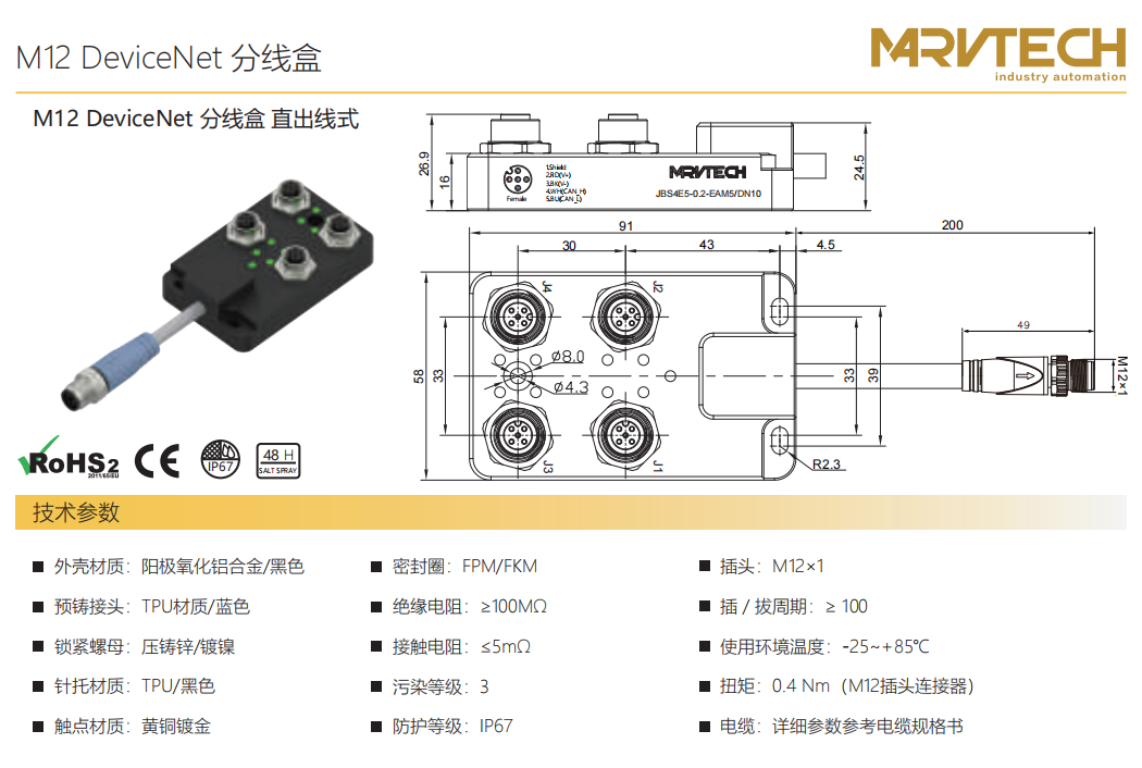M12 DeviceNet分線ボックス-直出線式