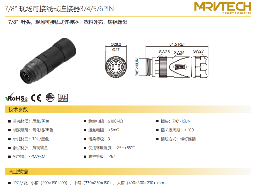 78”−針−現場結線可能コネクタ−プラスチックハウジング−アルミニウム鋳