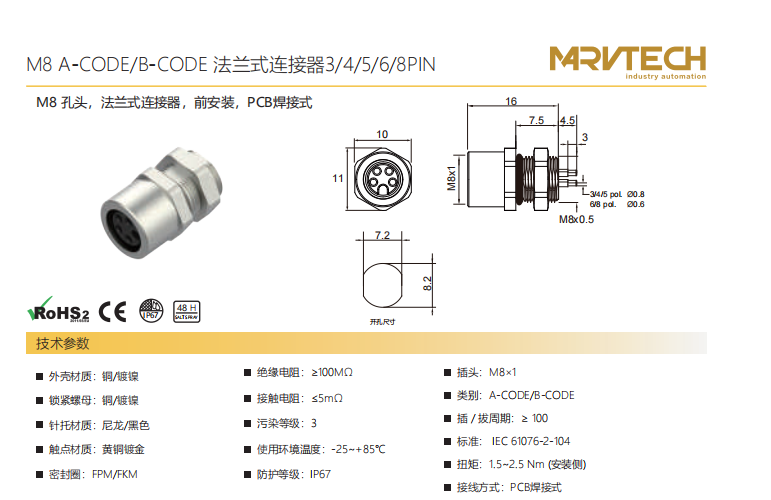 M 8-口金-フランジコネクタ-フロントマウント-PCB溶接式-3+4+5+6+8 PIN