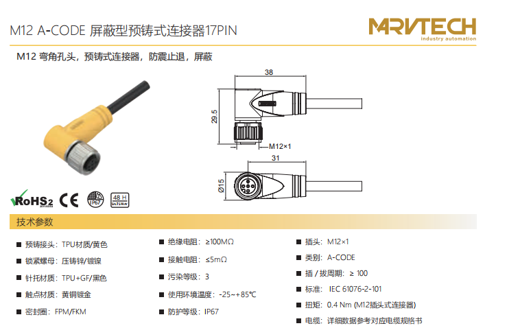 M 12-コーナータップ-プレキャストコネクタ-防振後退防止-シールド-17 PIN
