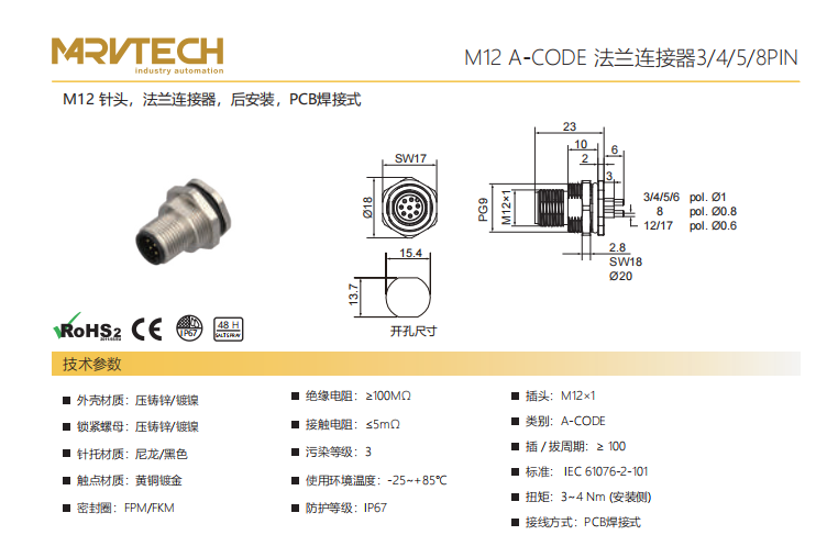 M 12-ニードル-フランジコネクタ-後付け-PCB溶接式-3+4+5+8 PIN