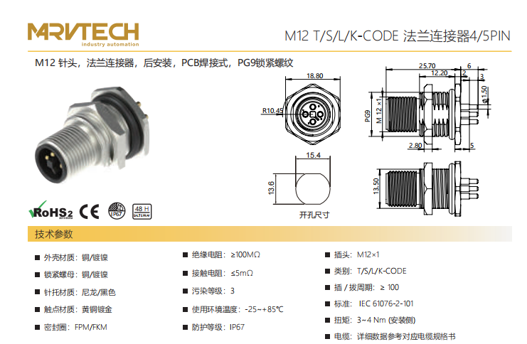 M 12-口金-フランジコネクタ-前取付-PCB溶接式-PG 9ロックねじ-4+5 PIN