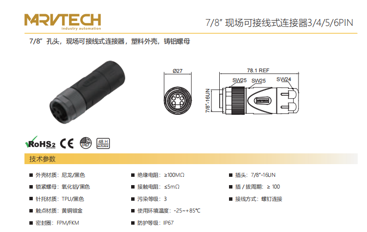 7+8"-コーナータップ-フィールド結線可能コネクタ-プラスチックハウジング-アルミニウムナット-3+4+5+6 PIN