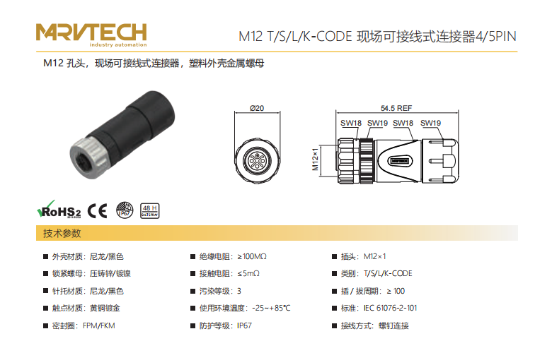 M 12-針-現場配線可能コネクタ-プラスチックケース金属ナット-4+5 PIN