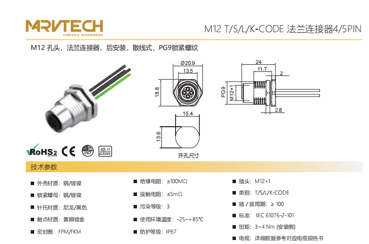 M 12-口金-フランジコネクタ-前取付け-散線式-PG 9ロックねじ-4+5 PIN