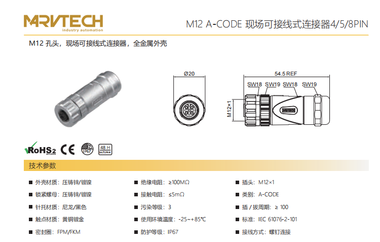 M 12-針-現場配線可能コネクタ-全金属ケース-4+5+8 PIN