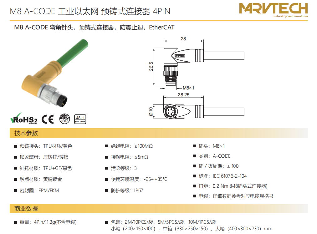 M 8 A-CODEコーナーニードル-プレキャストコネクタ-防振後退防止-EtherCAT-4 PIN