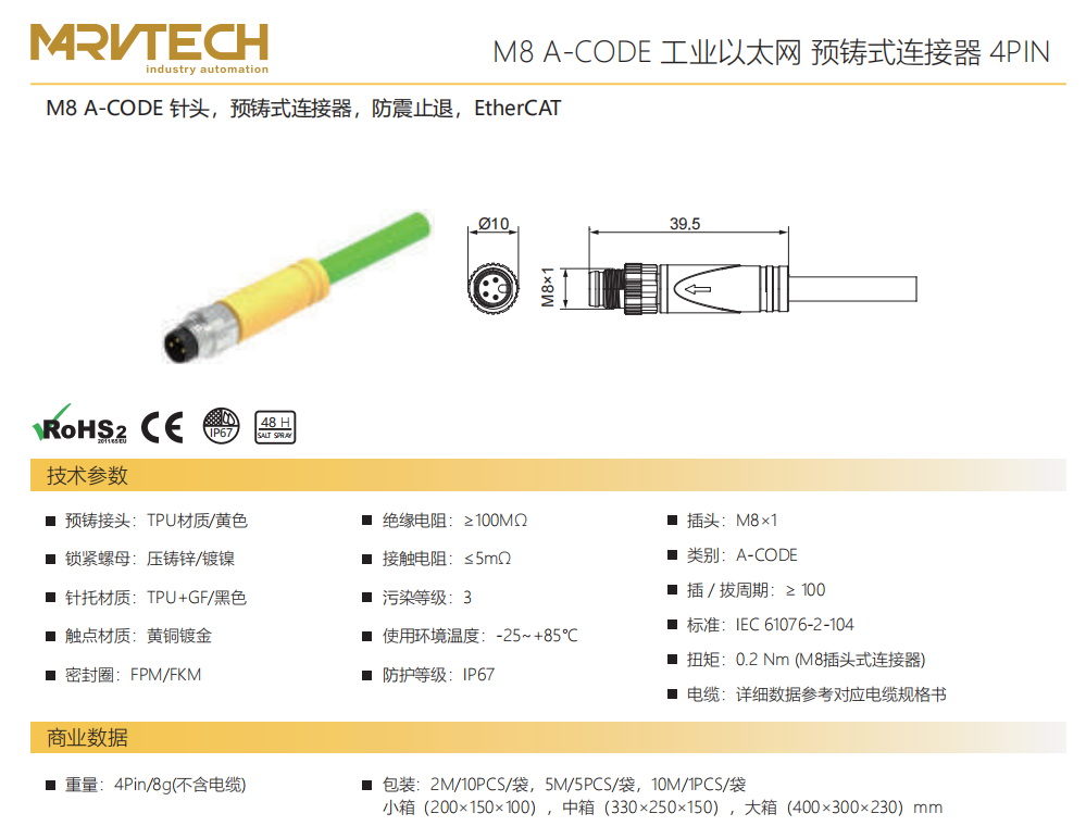 M 8 A-CODE針-プレキャストコネクタ-防振後退防止-EtherCAT-4 PIN