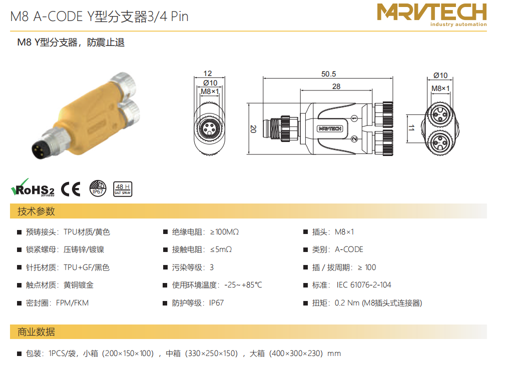 M 8 D-CODE針-プレキャストコネクタ-防振後退防止-EtherCAT-4 PIN