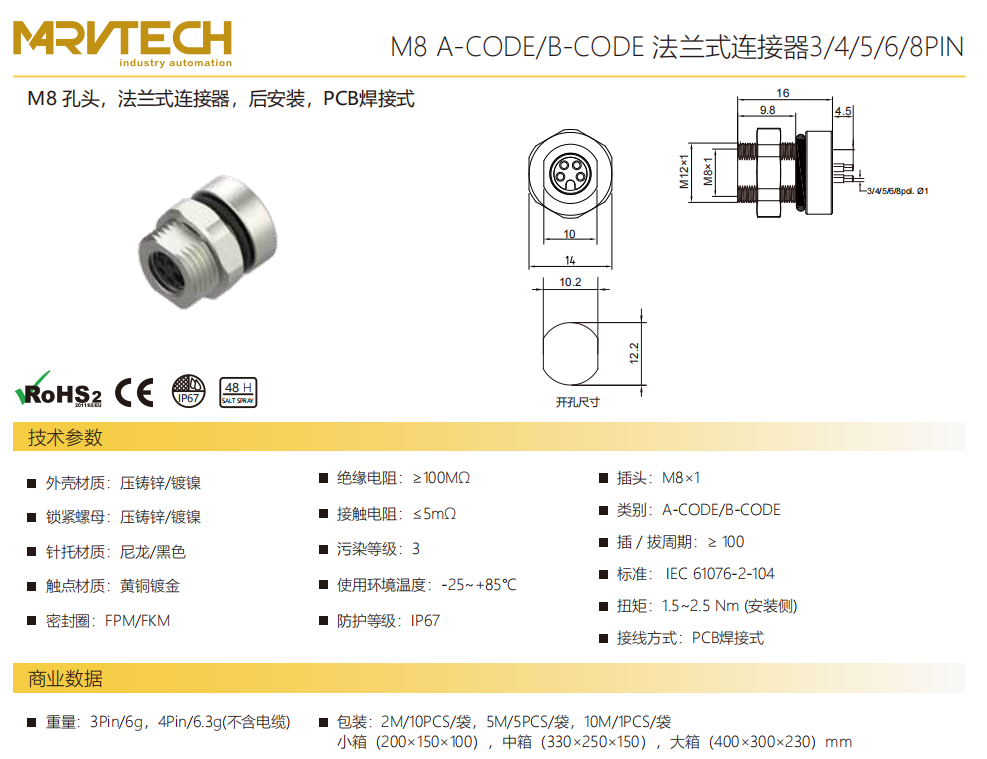M 8口金-フランジコネクタ-後付け-PCB溶接式-3/4/5/6/8 PIN