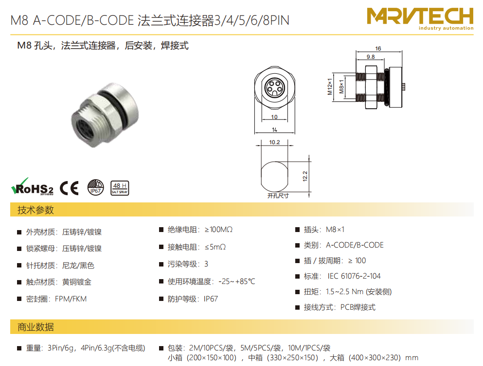 M 8口金-フランジコネクタ-後付け-PCB溶接式-3/4/5/6/8 PIN