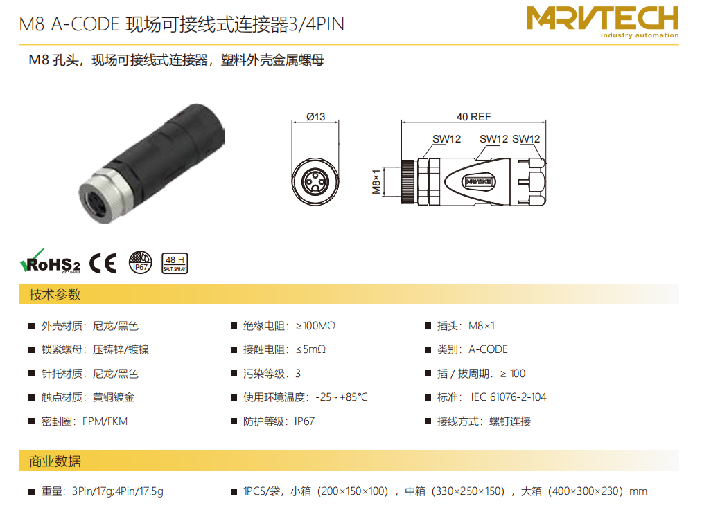 M 8端子-フィールド結線可能コネクタ-3/4 PIN