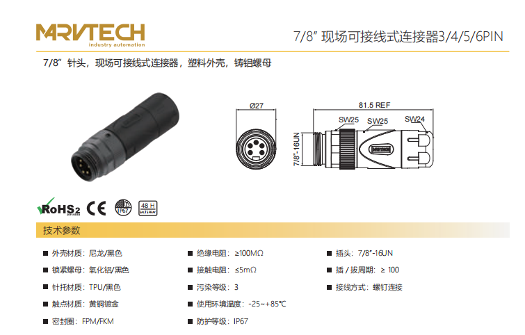 7/8"-針-現場結線可能コネクタ-プラスチックケース-アルミニウム鋳造ナット-3+4+5+6 PIN