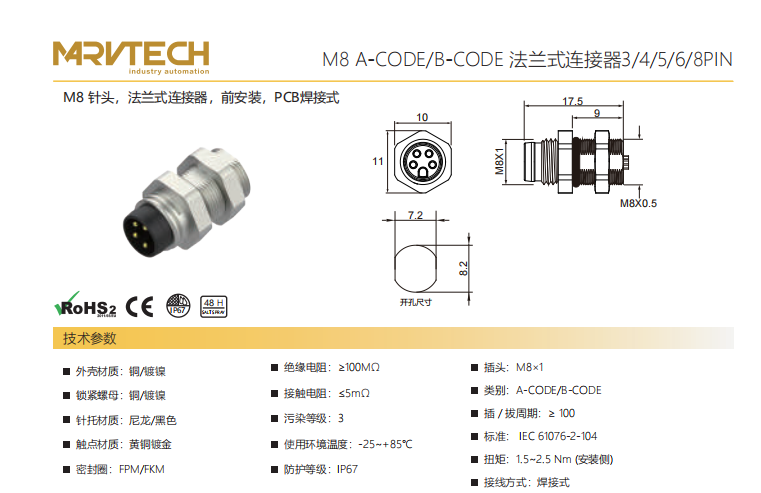 M 8-ニードル-フランジコネクタ-フロントマウント-PCB溶接式-3+4+5+6+8 PIN