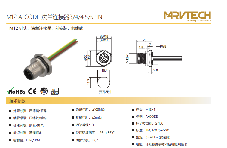 M 12-ニードル-フランジコネクタ-前取付け-散線式-3+4+4.5+5 PIN