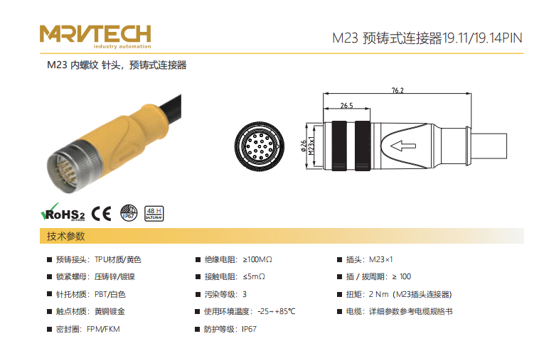 M 23-雌ねじ-針-プレキャストコネクタ-19.15 PIN