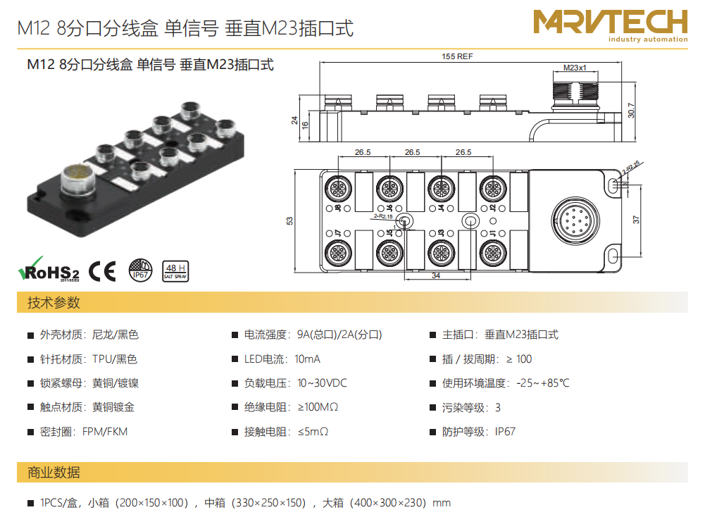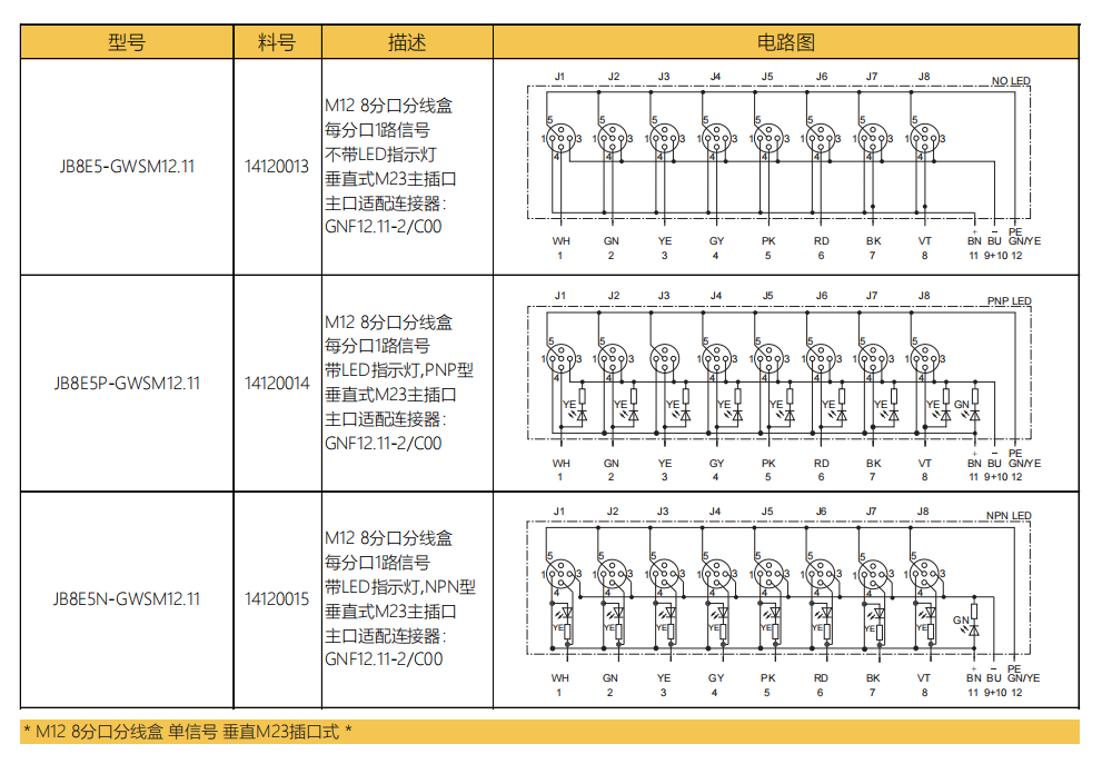 M 12 8タップ分線ボックス-単信号-垂直M 23ソケット式