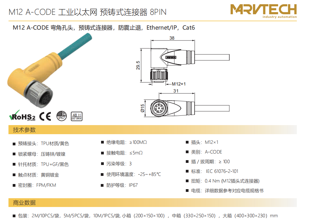 M 12 A-CODEコーナータップ-プレキャストコネクタ-防振後退止め-Cat 6-8 PIN