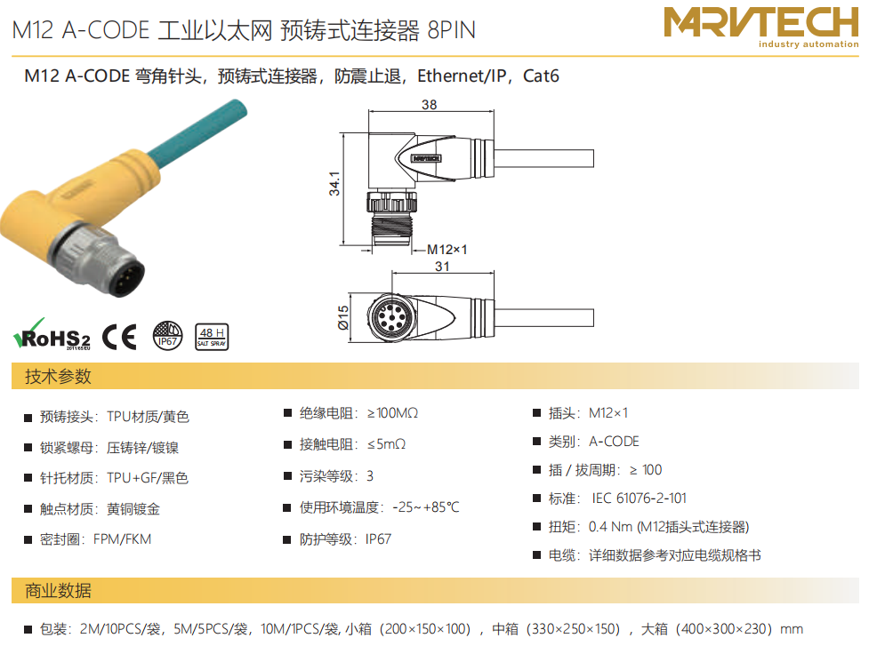 M 12 A-CODEコーナーニードル-プレキャストコネクタ-防振後退止め-Cat 6-8 PIN
