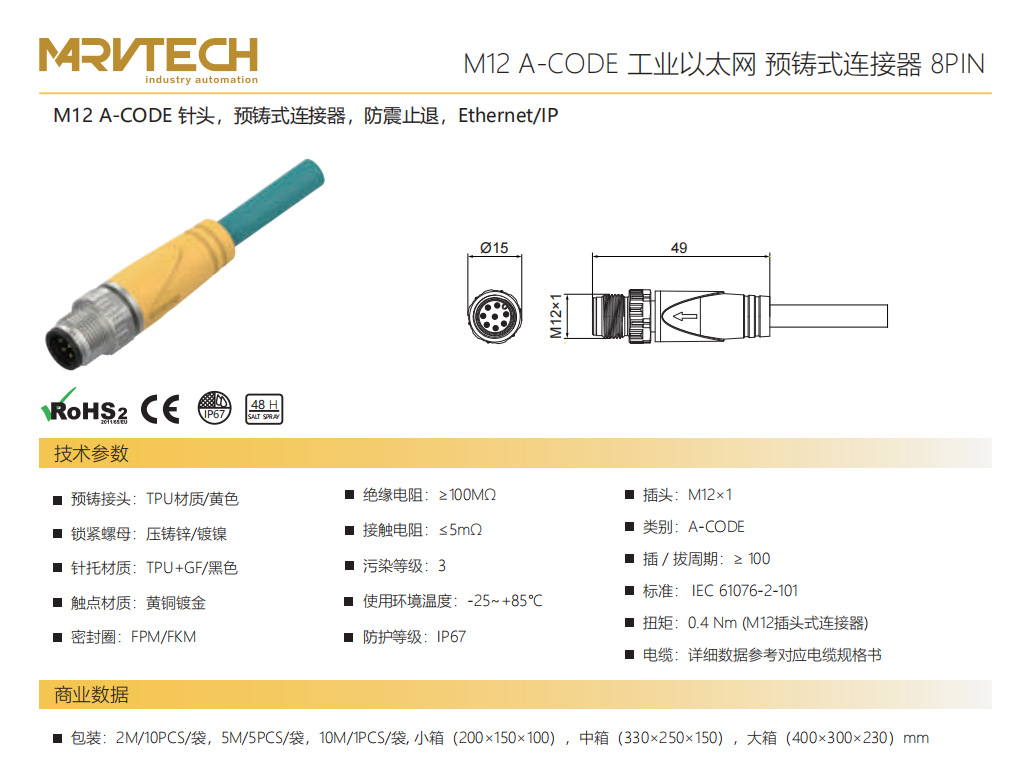 M 12 A-CODE針-プレキャストコネクタ-防振後退防止-Cat 6-8 PIN