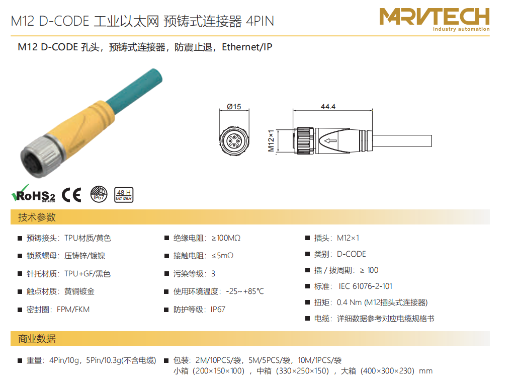 M 12 D-CODE口金-プレキャストコネクタ-防振後退防止-EtherCAT-4 PIN