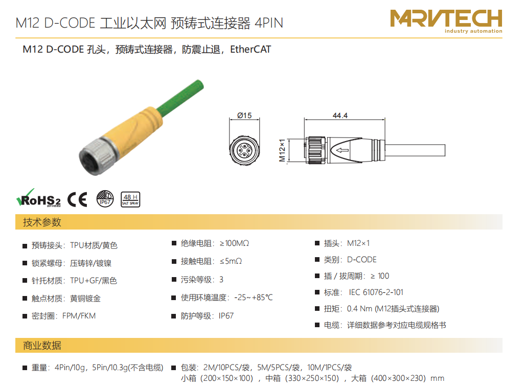M 12 D-CODE口金-プレキャストコネクタ-防振後退防止-EtherCAT-4 PIN
