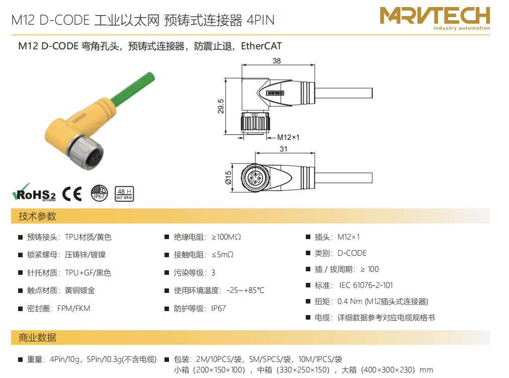 M 12 D-CODE曲げ角穴子-プレキャストコネクタ-防振後退止め-EtherCAT-4 PIN