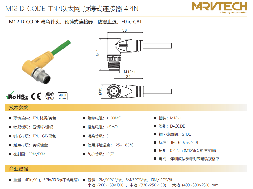 M 12 D-CODEコーナーニードル-プレキャストコネクタ-防振後退防止-EtherCAT-4 PIN