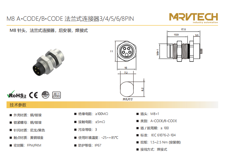 M 8-ニードル-フランジコネクタ-フロントマウント-PCB溶接式-3+4+5+6+8 PIN