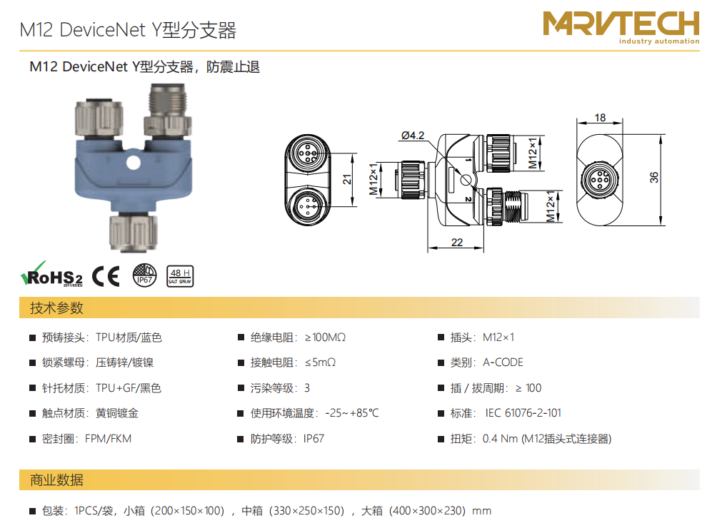 M 12 DeviceNet Y型分岐器-防振後退防止
