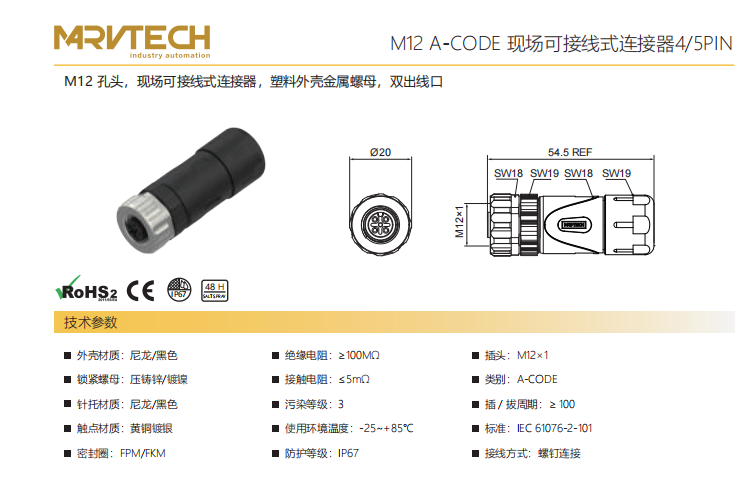 M 12-コーナーニードル-現場結線可能コネクタ-プラスチックケース金属ナット-4+5+8 PIN