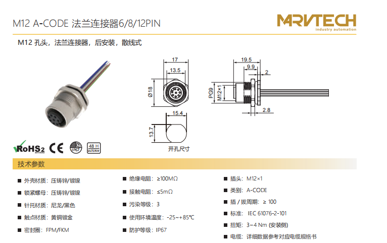 M 12-口金-フランジコネクタ-後付け-散線式-6+8+12 PIN