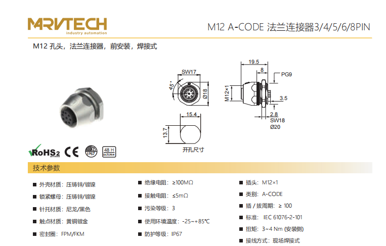 M 12-口金-フランジコネクタ-フロントマウント-PCB溶接式-3+4+5+8 PIN