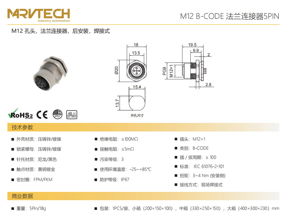 M 12口金-フランジコネクタ-前取付-PCB溶接式