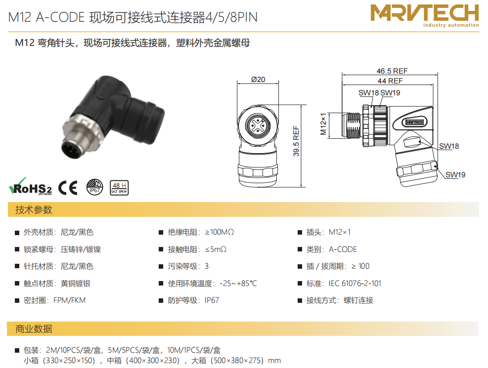 M 12コーナーニードルA-CODE現場配線可能コネクタ