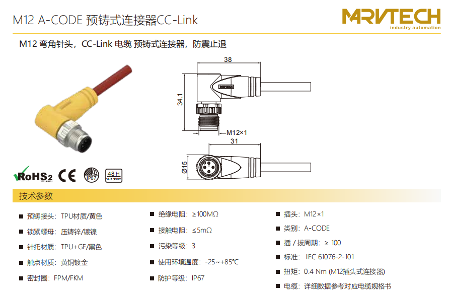 M 12コーナーニードル-CC-Linkケーブル-プレキャストコネクタ-防振後退防止